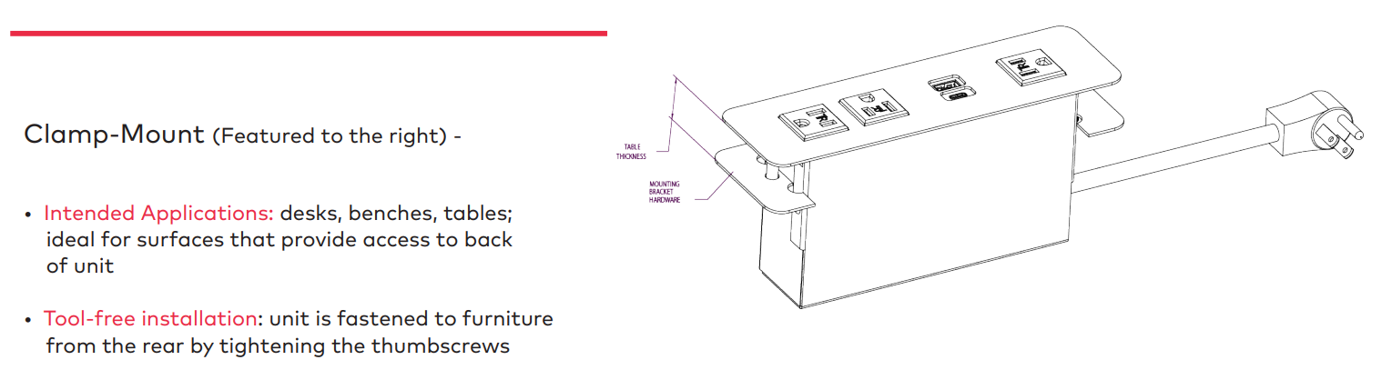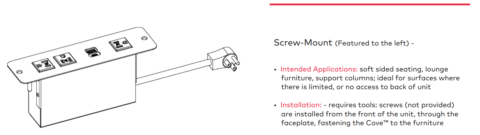 ECA’s Cove™ Corded Series is a charging solution designed to seamlessly integrate power, USB charging ports, and data capabilities into a variety of spaces. Spill-resistant receptacles protect the inset power outlet against unexpected hazards and provide freedom to mount the Cove unit face-up on table surfaces. The outlet and data receptacles are strategically oriented to optimize the surface area of each unit, accommodating large and small device plugs. This surface-mounted power outlet can be ordered in 2 or 3-power outlet models with 2 USB ports.. *Units are recessed into the surface, so please double-check your cutout size or call us for assistance!
