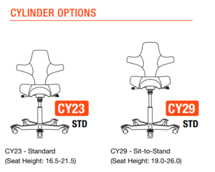 - CY23 16.5"-21.5"H; CY29 19"-26"H; CY37 22.5"-32"H