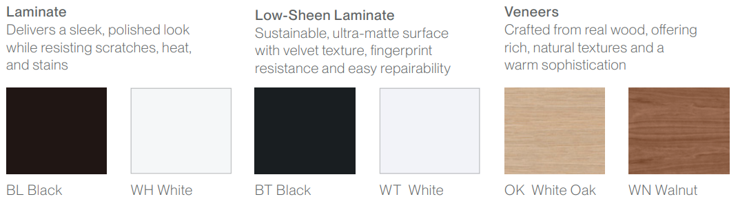 - Worksurface options includes Laminate, Low-Sheen Laminate, and Veneers