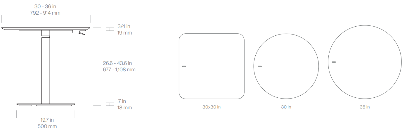 - 30" Diameter, 36" Diameter, 30"W x 30"D