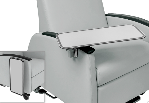 - Adjustable Side Tray swivels at base and can be positioned vertically at side of arm when not in use (extends 4” from arm). Measures 23” L x 10.7”W. Attached to recliner arm via included Quick Release Bracket, on left or right side (when facing chair). Access to handle may be impeded when specified on same side as handle.