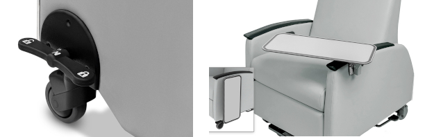 - Optional 4" Two Caster Lock & Steer: Controlled by 3-position lever located at back of chair on left (facing) arm. Steer setting locks rear casters to forward-facing orientation. Neutral setting allows all casters to swivel freely. Lock setting locks recliner into stationary position.